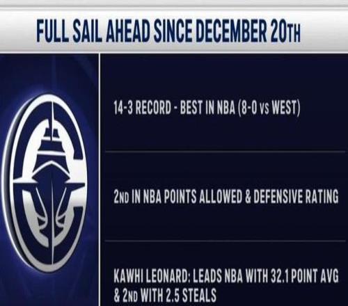 尽管一度看起来遥不可及,但在之后的17场比赛中,快船队取得了14胜3负的战绩,NBA同期战绩最佳。此外,他们还打出了同期第二少的失分以及防守效率。快船球星伦纳德在此期间场均32.1分,并且贡献了同期第二多的场均2.5次抢断。